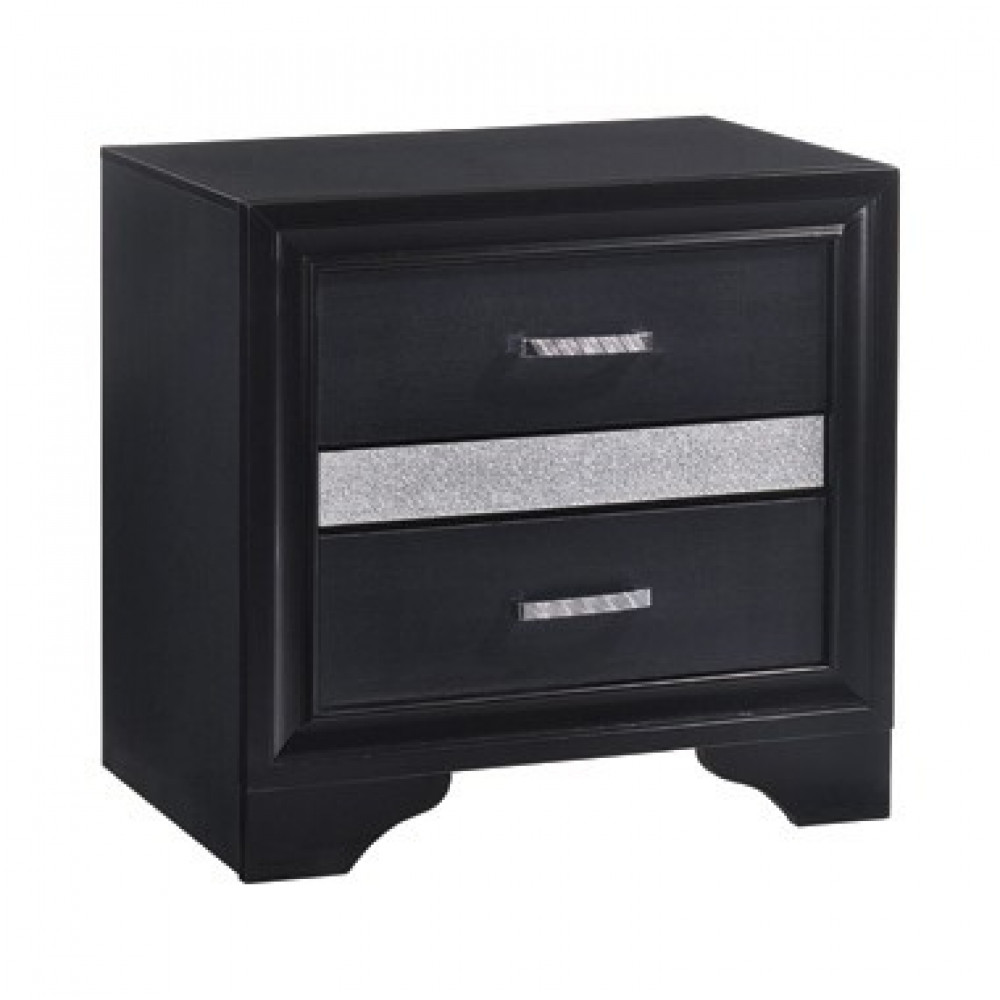 Create a stunning bedroom ensemble that's fit for modern royalty. Each gorgeous piece in this four-piece set flaunts silvery, sparkling accents for a truly glamorous look. The bed features a solid, straight silhouette and two storage drawers built into the base. The case pieces bring you even more storage space to keep your room looking neat and tidy. Available in a variety of colors and sizes, there's an option to bring any bedroom to life. Set includes Bed, Dresser, Mirror & nightstand