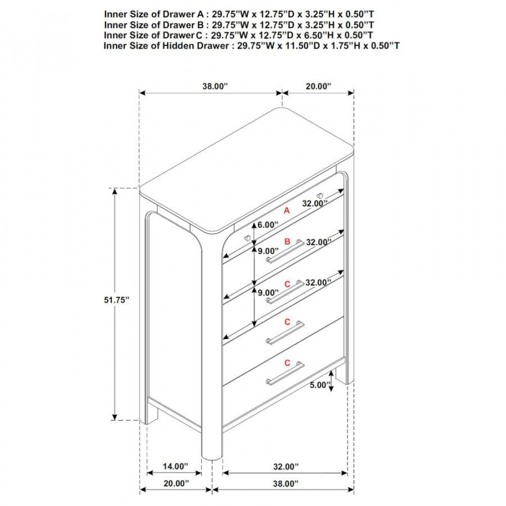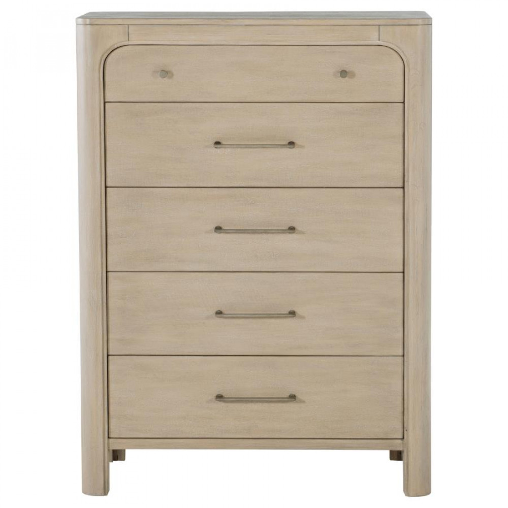 - Five-drawer chest with sculpted corners and softened lines for elegant bedroom storage