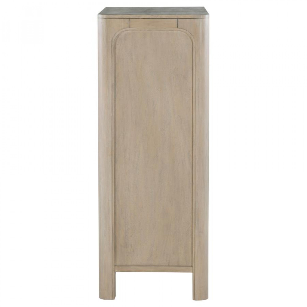 Gracefully composed with rounded edges and sculptural form, this five-drawer chest evokes a quiet sophistication. Its tall silhouette offers a sense of order, while sculpted corners and subtle detailing bring soft elegance to the bedroom. A felt-lined top drawer and hidden compartment add thoughtful layers of function. Crafted with care and presence, it offers both beauty and intrigue in equal measure.