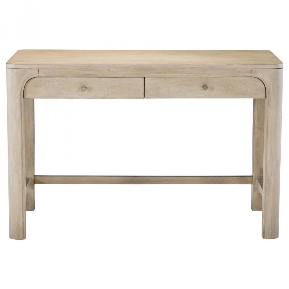 - Vanity desk with sculpted legs and curved edges for a soft, modern makeup table profile