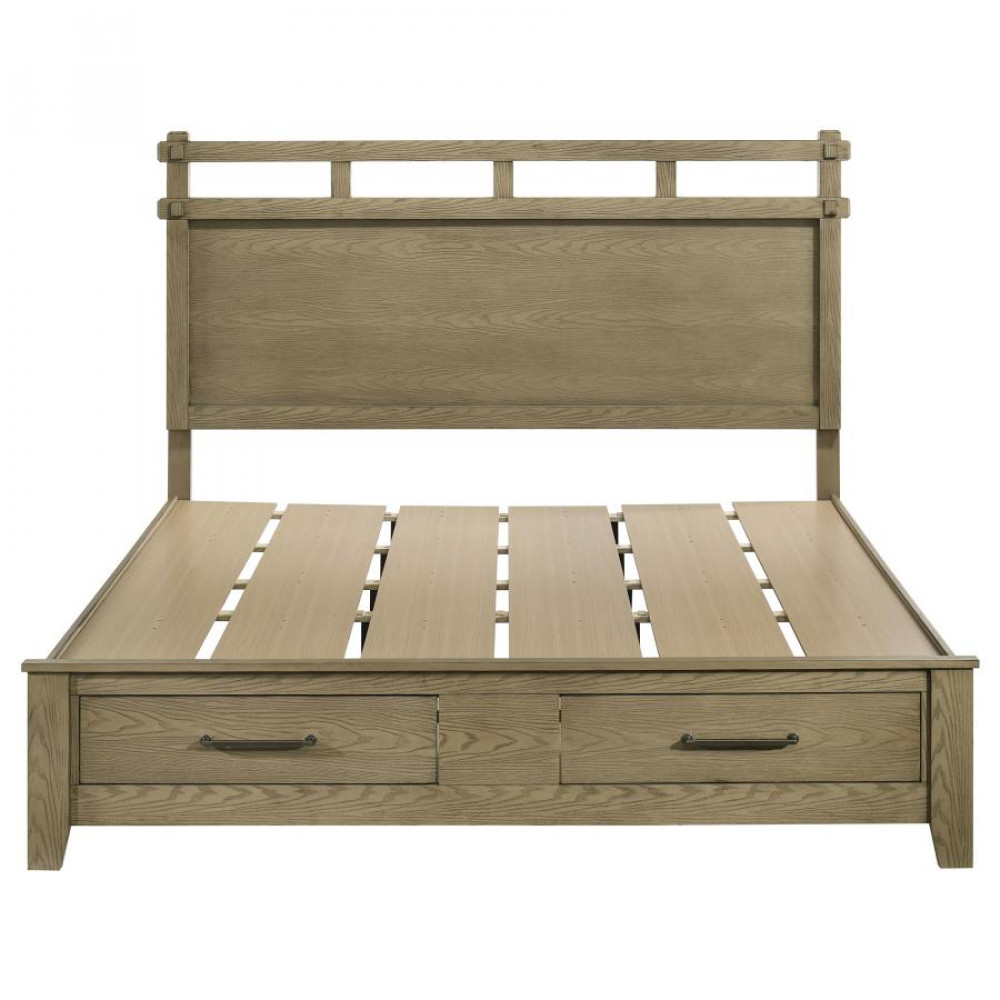 - Eastern king platform storage bed finished in vineyard oak with oak grain embossed veneer