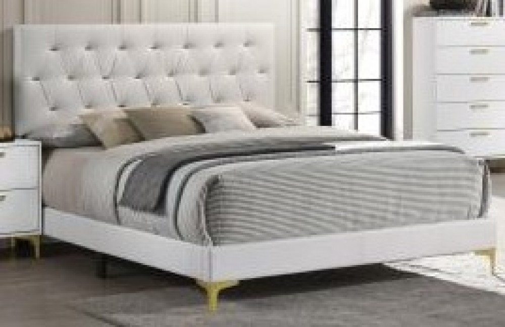 Instantly elevate the look of your bedroom oasis with this modern glam bedroom set. Chic, warm, gold elements lend a luxe accent to the upholstered platform bed and accompanying pieces. The bright, white finish sets the stage and offers a clean, contemporary aesthetic with a light and airy expression. The lovely headboard takes your breath away with its diamond tufted design and striking bar button details. Matching the warm, golden buttons are gold bracket legs, adding elevation to the bed and a retro-inspired look and feel.