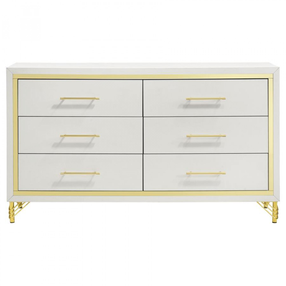 Accentuate surrounding decor with the sophistication of a modern six-drawer dresser. Designed for ample storage, it features a refined look with spacious drawers ideal for everything from clothing to accessories and linens. Its bright white finish is crisp and chic, complemented perfectly with rich, warm gold trim that gleams in the light. Decorative legs have hairpin inspired style, offering a stylish touch of vintage energy. Long bar pulls complete the look with polished perfection.