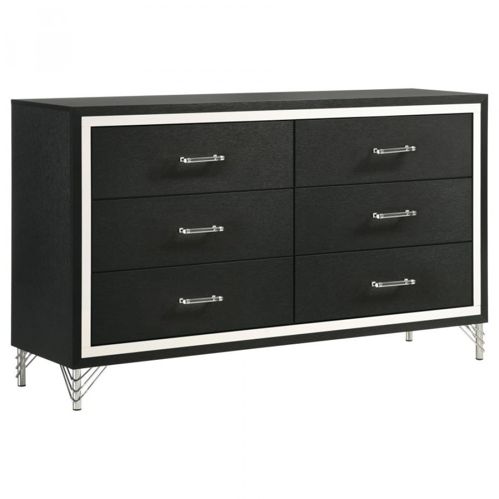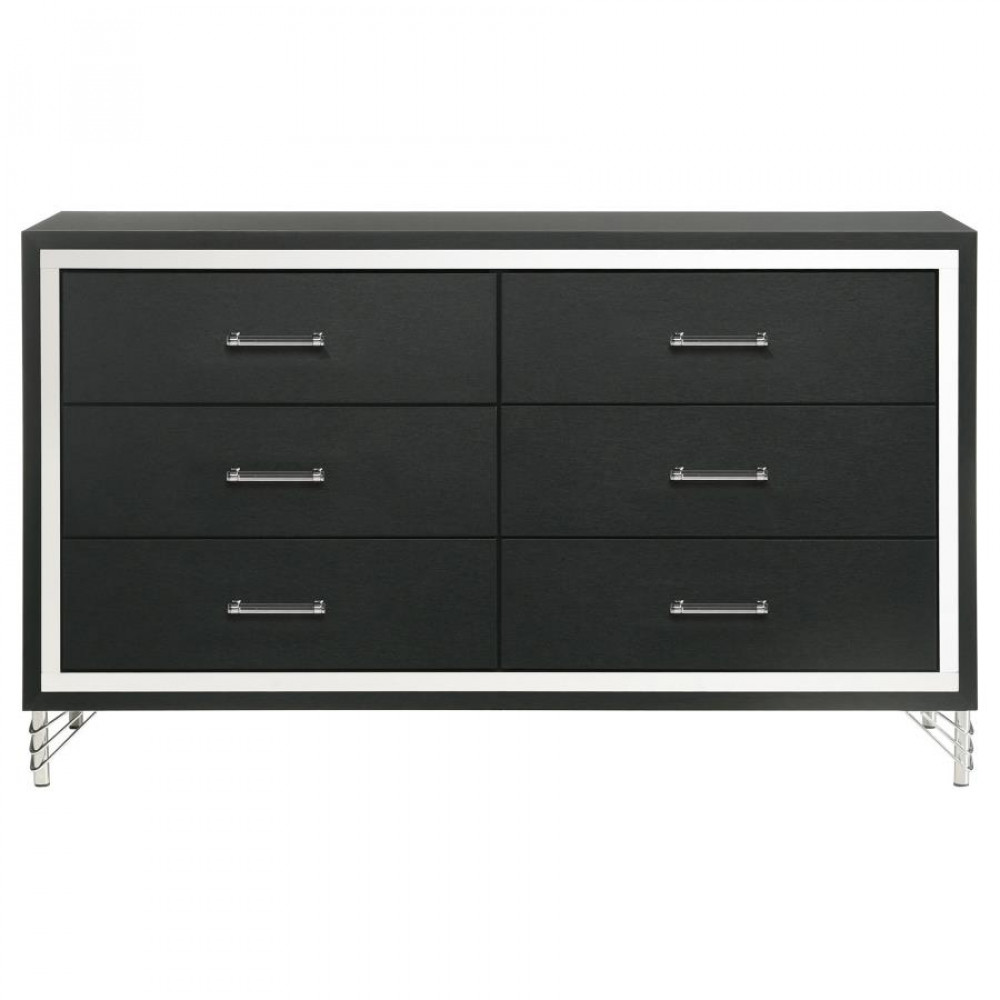 Accentuate surrounding decor with the sophistication of a modern six-drawer dresser. Designed for ample storage, it features a refined look with spacious drawers ideal for everything from clothing to accessories and linens. Its bold black finish is crisp and chic, complemented perfectly with rich, cool chrome trim that gleams in the light. Decorative legs have hairpin inspired style, offering a stylish touch of vintage energy. Long bar pulls complete the look with polished perfection.