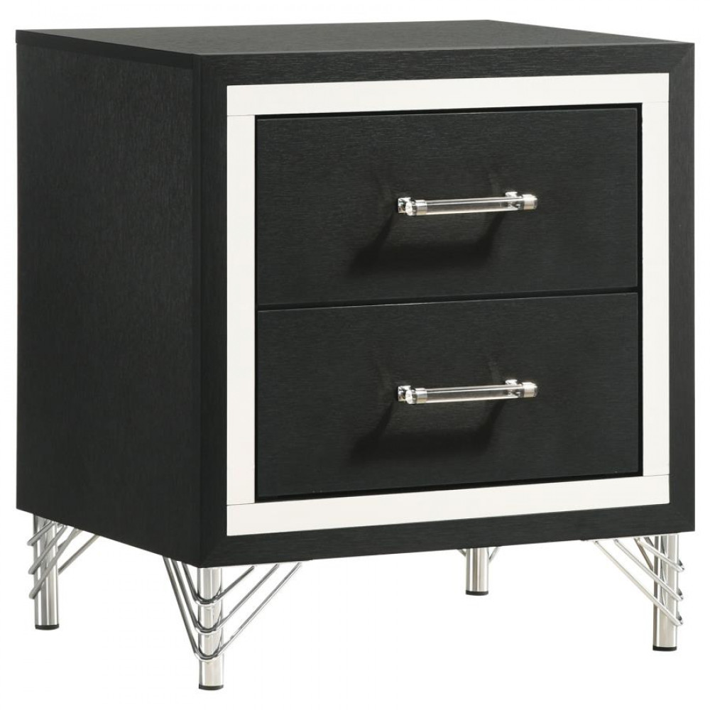 Gleaming chrome trim captures attention on a modern two-drawer nightstand. Perfect for your sophisticated bedside, it boasts a bold black finish case that offers the perfect touch of depth with its chrome trim. A pair of long bar pulls decorate drawer fronts. Hairpin style legs offer vintage flair and exceptional elegance. Two drawers add plentiful bedside storage, offering a place to ruck away personal items and overnight essentials