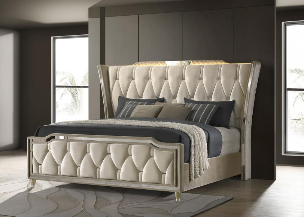 - Eastern king bed upholstered in ivory and camel velvet with tufted wingback silhouette