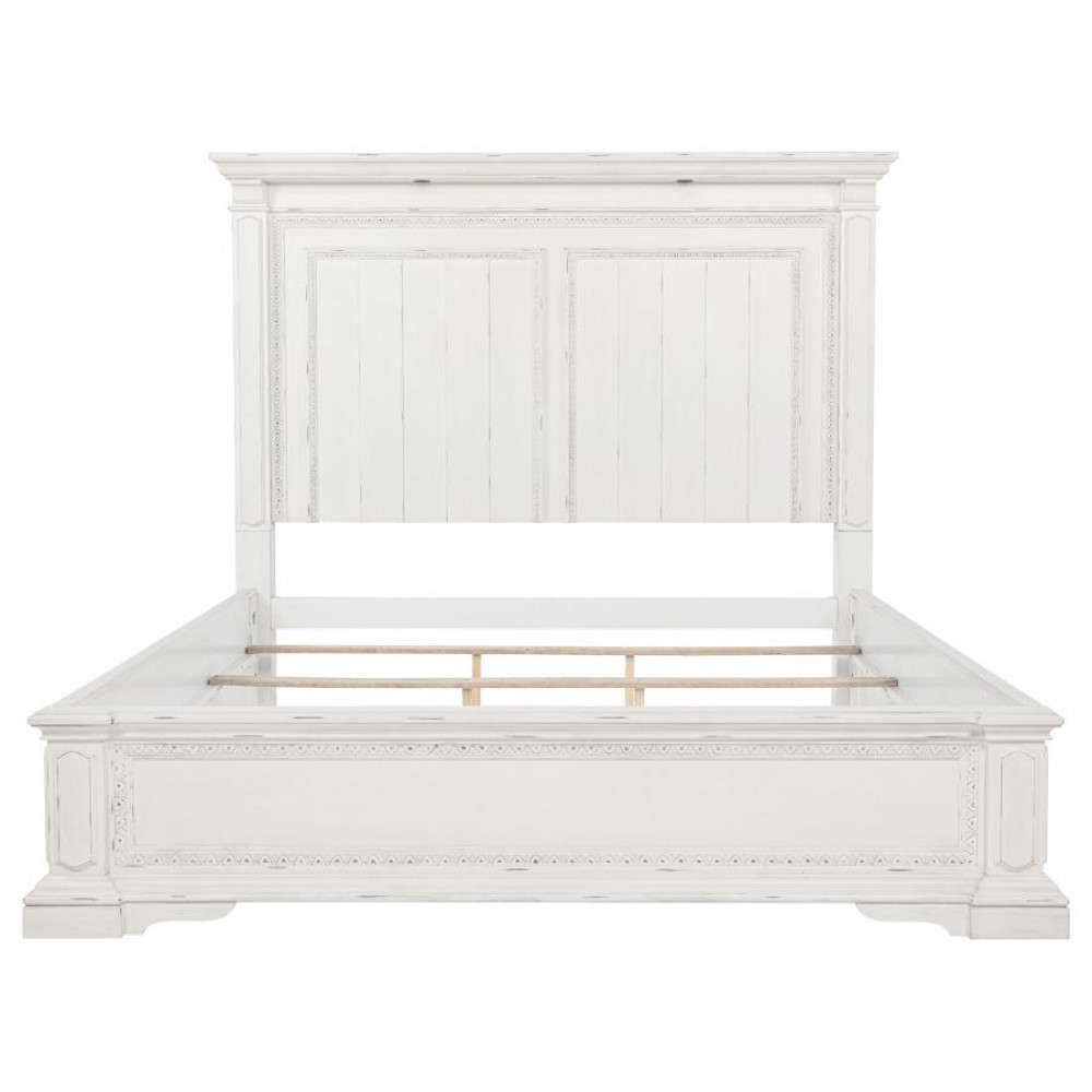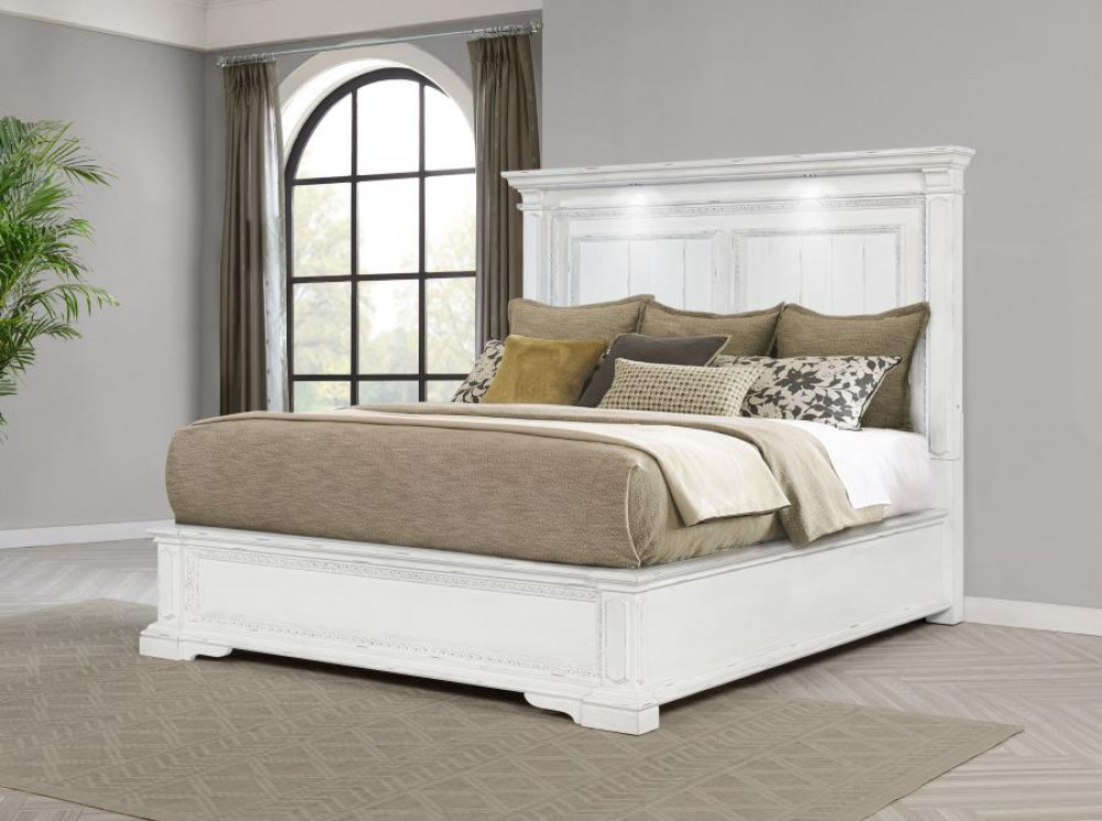 Infused with vintage elegance and practical design, this panel bed offers timeless structure with thoughtful detail. Ornate molding and recessed panels lend refined character, while a distressed white finish softens the frame with antique charm. Dual LED reading lights are subtly tucked beneath the crown—one on each side—casting focused illumination downward. Crafted from poplar and engineered wood, it brings beauty and everyday function into perfect balance.