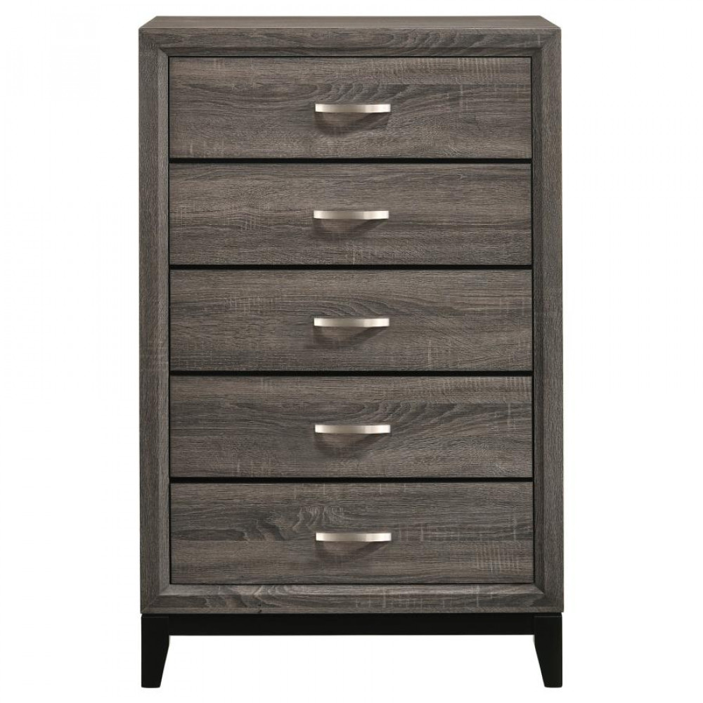 Modern design meets weathered appeal in this four-piece bedroom collection for a master or second bedroom. Each piece of the set has a gray oak finish with contrasting black accents and frames for a look that's understated yet bold. The queen bed has an impressive headboard and low footboard with black rectangular paneled accents. The elegant nightstand and dresser have deep drawers with lustrous silvery accented handles. The matching mirror has straight lines and is a perfect fit for the gorgeous dresser.