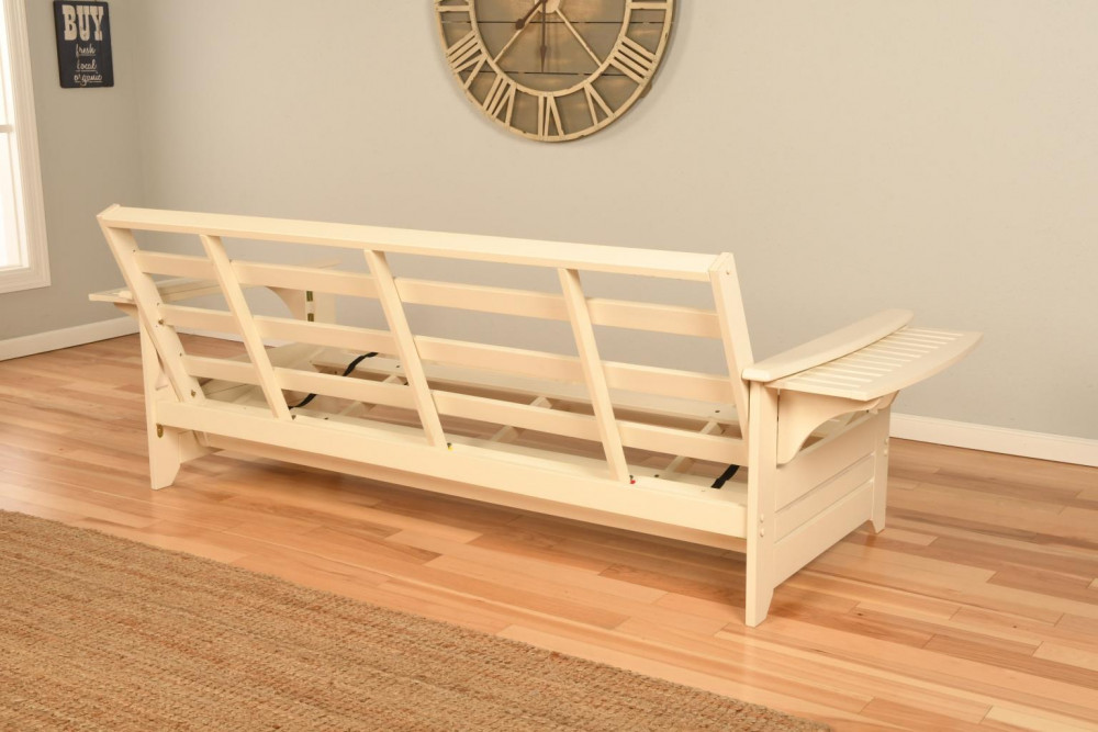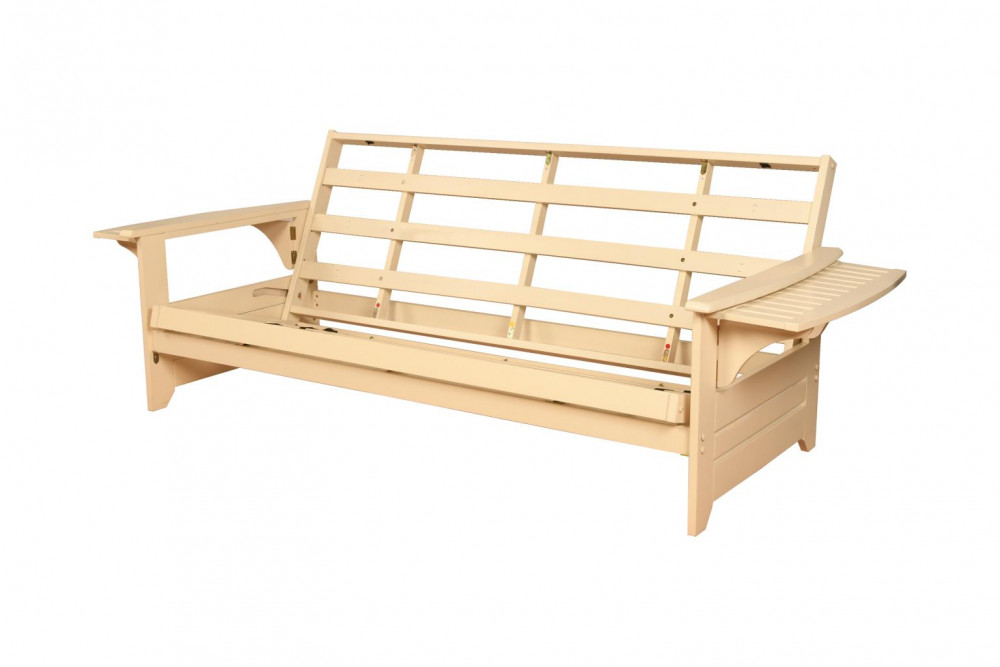 Exceptional function and artistry are featured in this solid wood futon frame. This piece is an excellent choice for a family room or game room. It offers three positions - sit, lounge and sleep to seamlessly transition from day to night. The convenient fold out arm trays of this piece will securely hold your snacks and drinks whether playing games or watching a movie. The clean, slat design and multiple color choice make this futon frame ideal for your home decor.