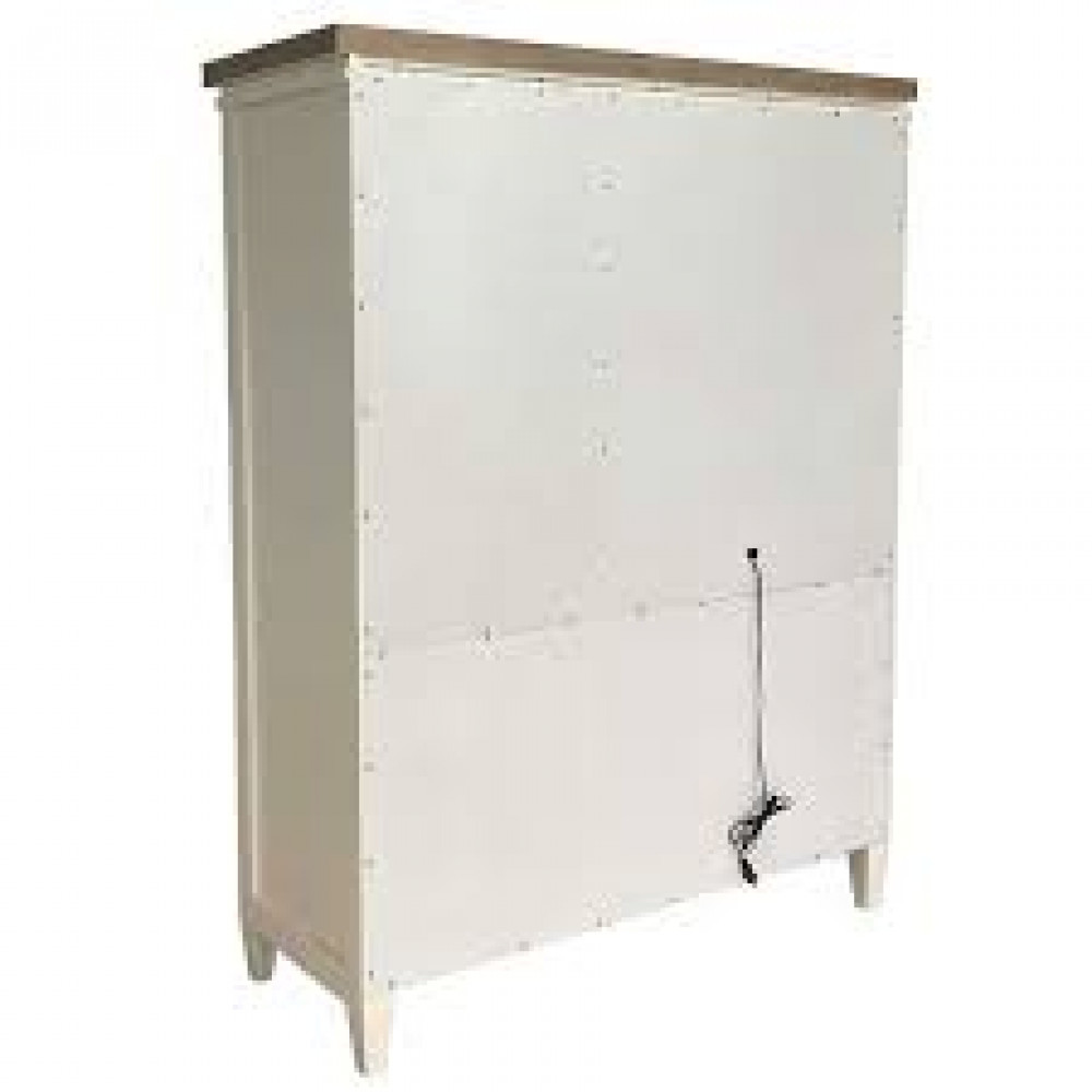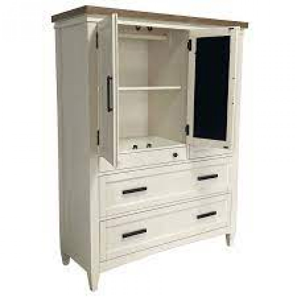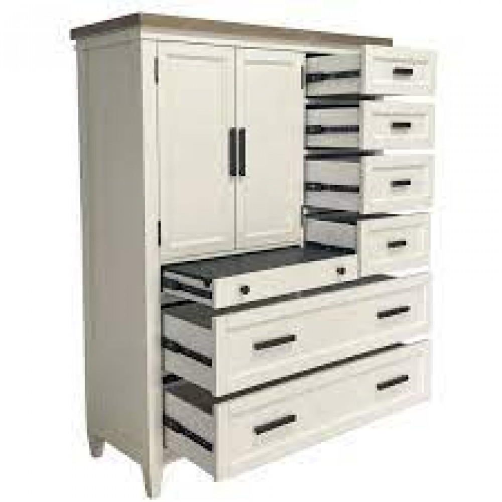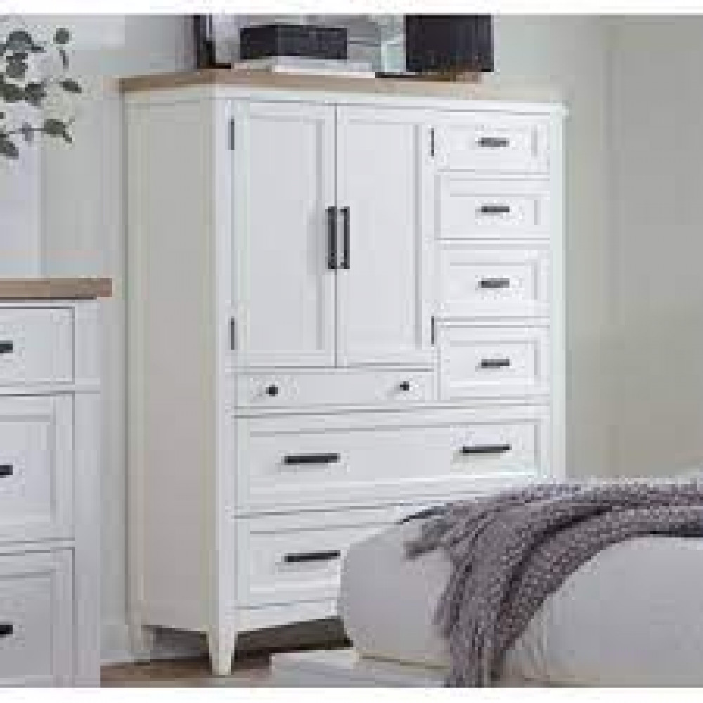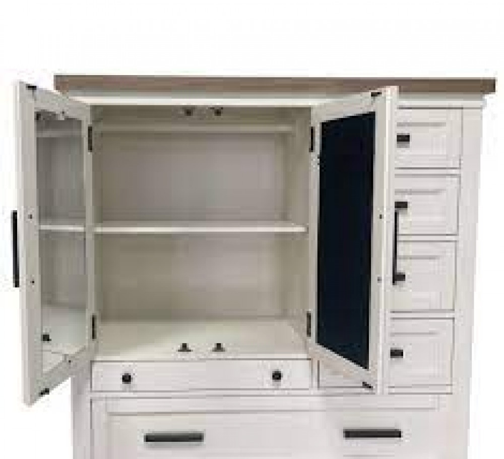 The seven-drawer, two-door chest is a stunning piece of furniture that brings timeless charm to your home. The fresh hand-painted Cotton finish with contrasting Weathered Natural top is beautifully complemented by the solid-metal custom hardware in authentic Burnished Bronze. Crafted from the finest materials, including poplar solids, birch veneers, and oak veneer tops, this chest is designed to last for years to come.