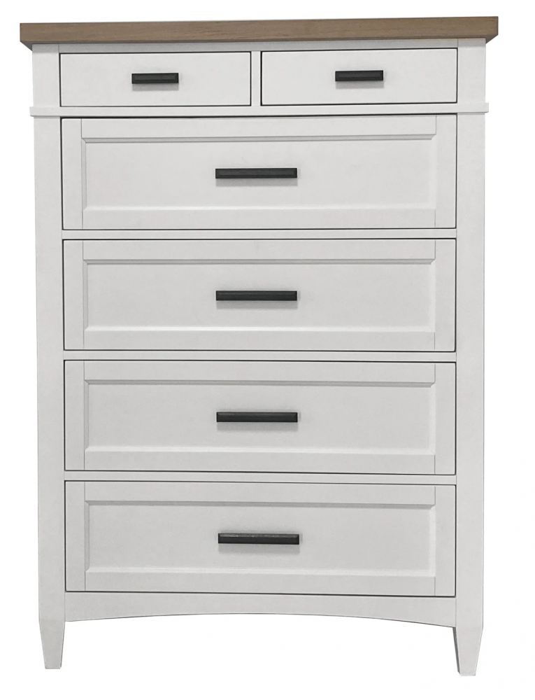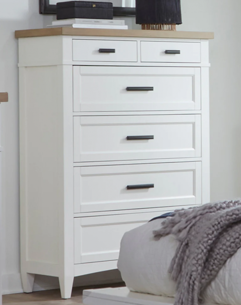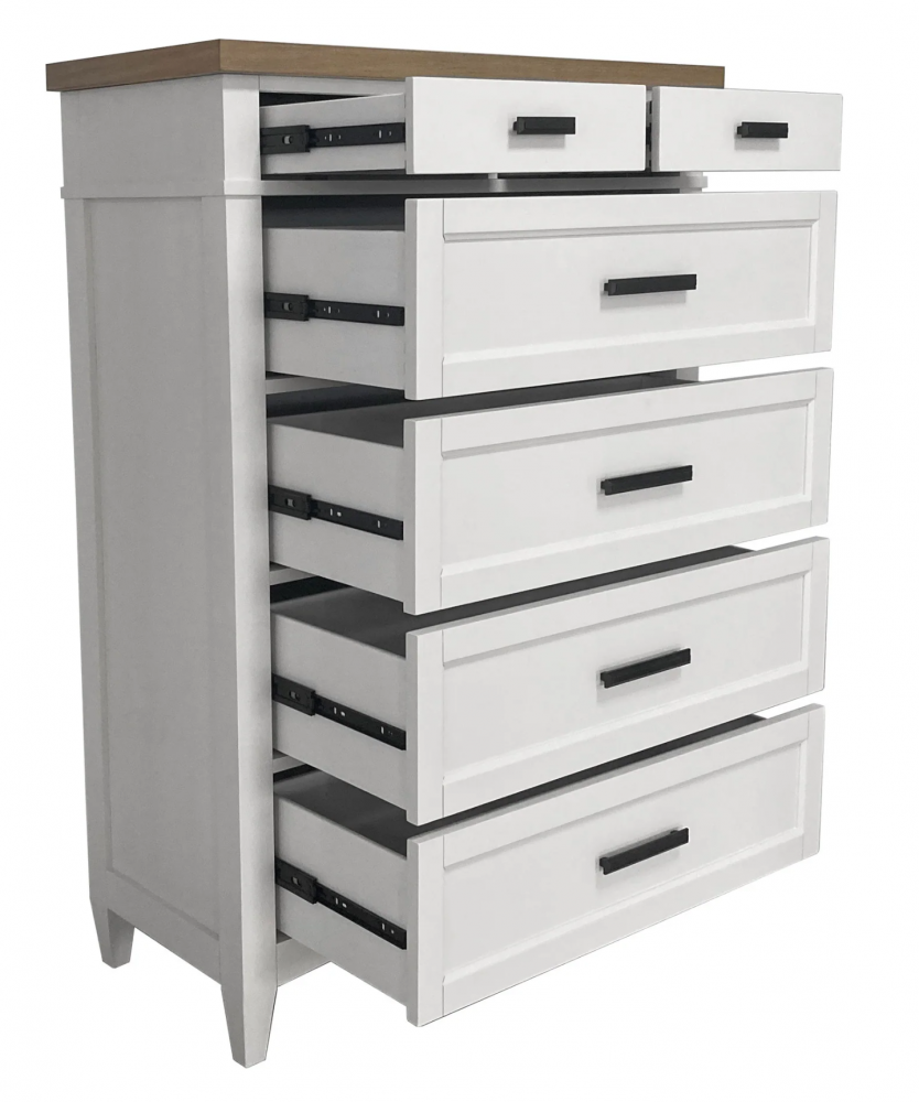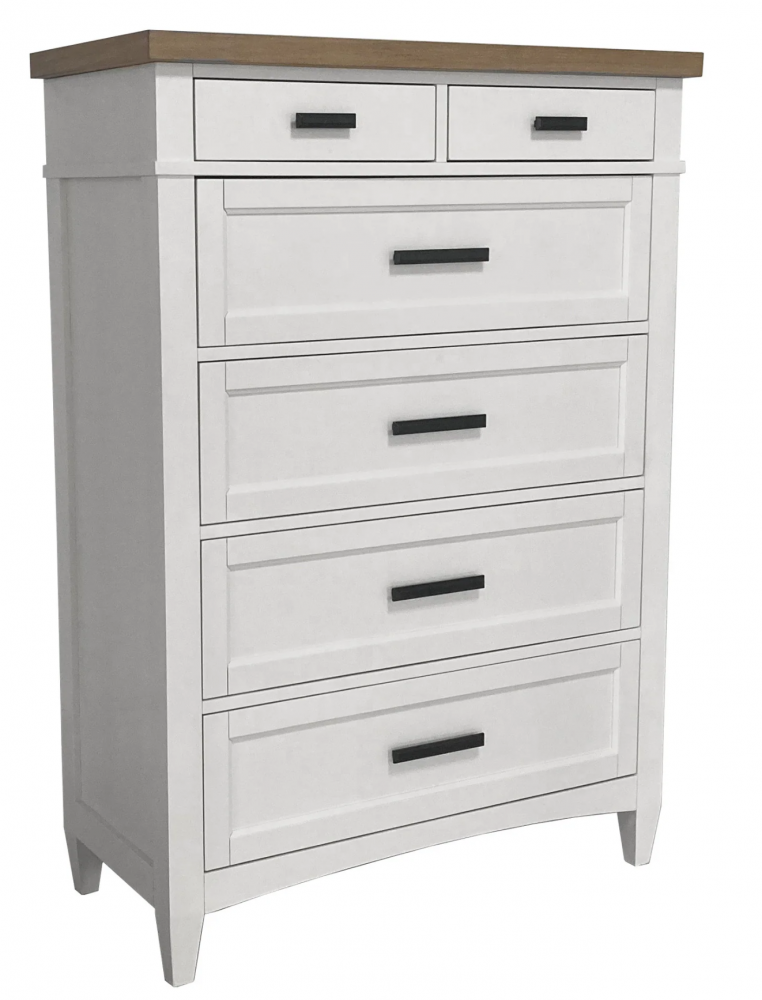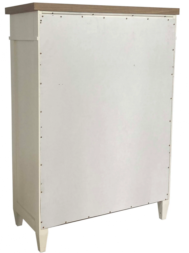 This six-drawer chest is expertly crafted from poplar solids and birch veneers with an oak veneer top and boasts a fresh, hand-painted cotton finish with a contrasting weathered natural top that exudes timeless charm. Solid-metal custom hardware in an authentic burnished bronze finish adds a touch of elegance to this piece. The tapered legs create an eye-catching silhouette, making this chest an elegant and functional addition to any bedroom.