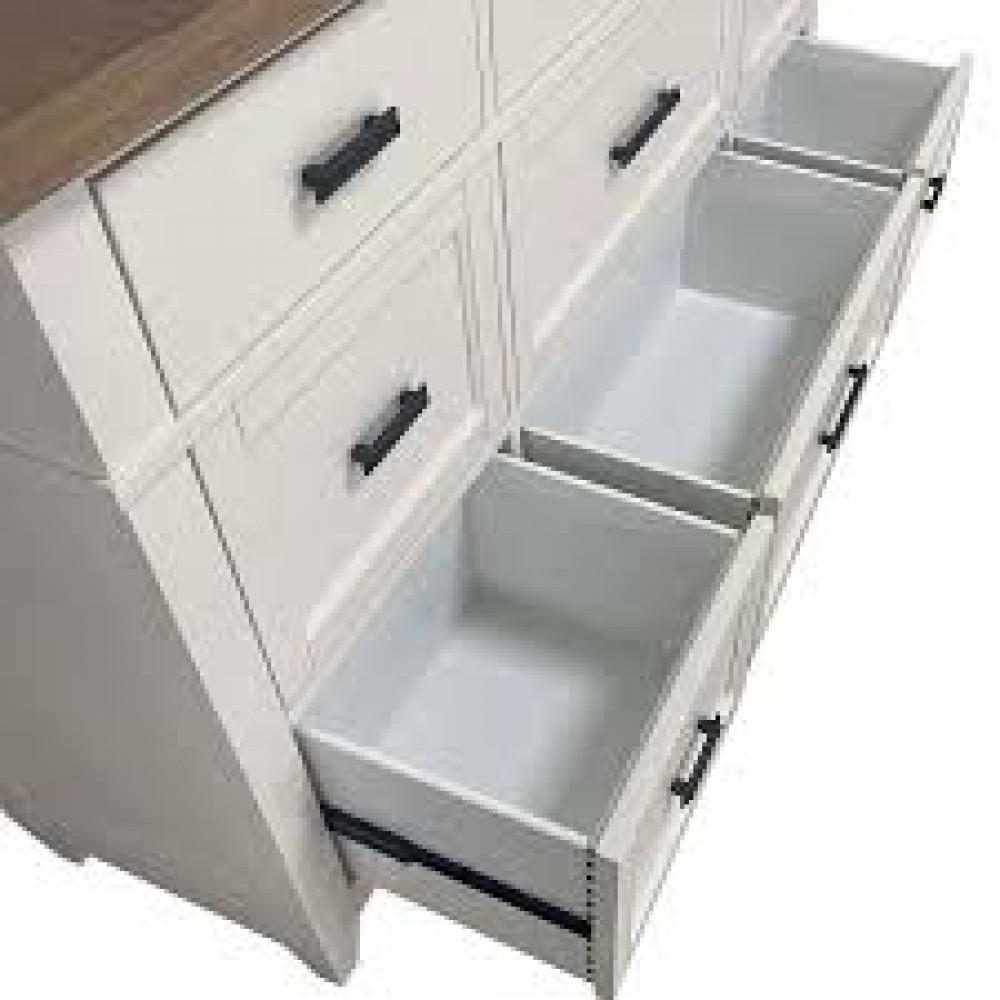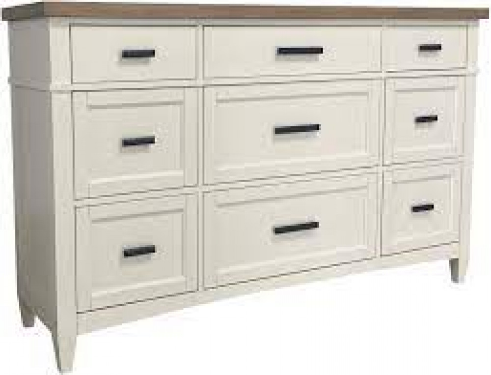 This nine-drawer dresser is a piece of furniture that exudes timeless charm and elegance. The hand-painted Cotton finish with contrasting Weathered Natural top creates a visually stunning design that will complement any bedroom décor. The dresser is crafted from the finest materials - poplar solids with birch veneers and oak veneer tops - ensuring long-lasting beauty and durability. The tapered legs create an eye-catching silhouette and add to the overall aesthetic of the dresser. The solid-metal custom hardware in authentic Burnished Bronze adds a touch of luxury and class to the dresser.