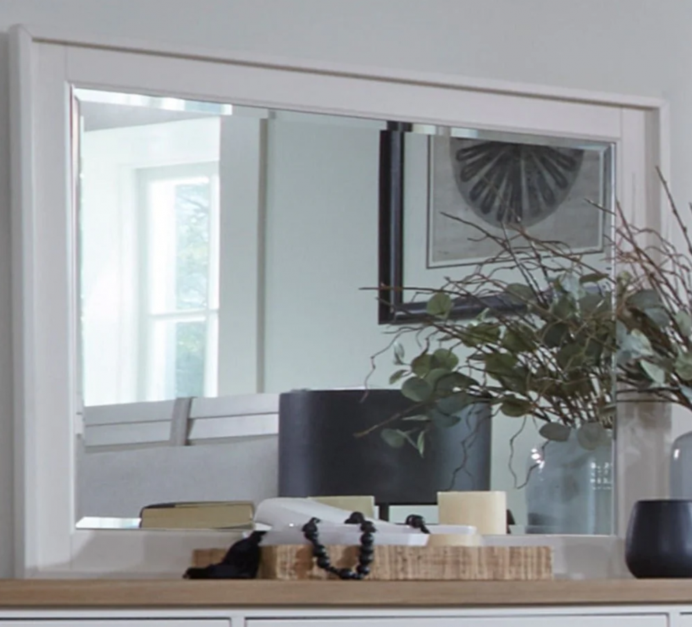 Expertly crafted from poplar solids and birch veneers, this mirror boasts a fresh, hand-painted Cotton finish that exudes timeless charm. The select woods are kiln-dried to ensure long-lasting beauty and minimize warping and splitting. The beveled mirror in a shadow box frame adds a unique and distinctive touch to any room in your home. Include Mirror Only!