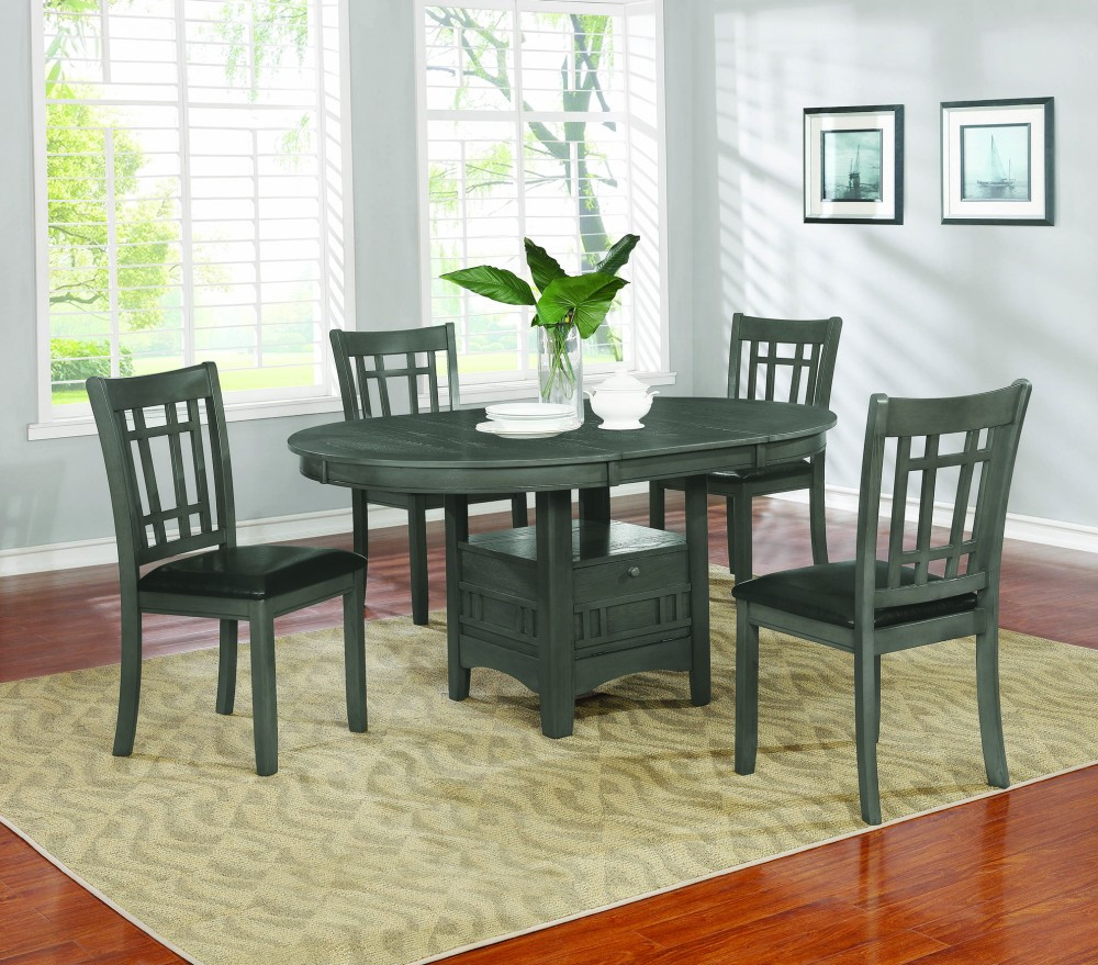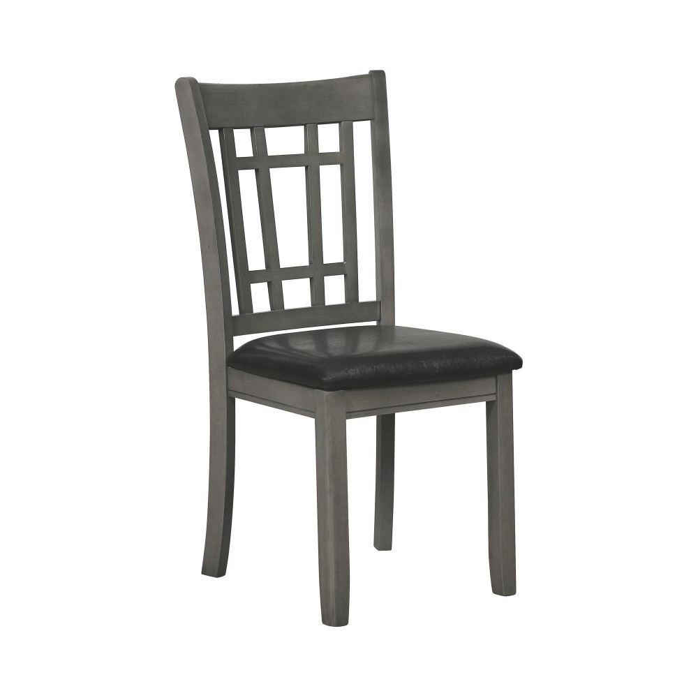 A combination of vertical and horizontal slats creates a window pane effect for this charming transitional dining chair. An armless silhouette is a versatile choice for relaxed, everyday living. The chair boasts a medium grey finish over Asian hardwood construction. Webbed seating and black faux leather upholstery combine for stylish comfort. Invite friends and family to have a seat and enjoy a lovely meal.