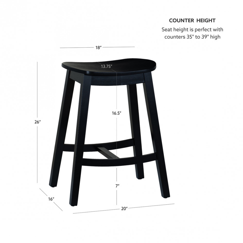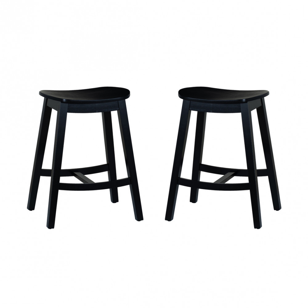 Bring a timeless look to your kitchen or home bar area with this pair of streamlined counter stools. Constructed from solid wood and finished in a sleek black stain, these stools feel right at home whether placed amongst modern, farmhouse, or transitional decor. The gently curved saddle seats are designed with ergonomics in mind, offering subtle support through casual meals and long conversations. Reinforced crossbars provide additional stability while also serving as convenient footrests. Perfect for kitchen islands, counters, or breakfast bars, this versatile pair combines functionality with an understated elegance for a long-term seating solution.
