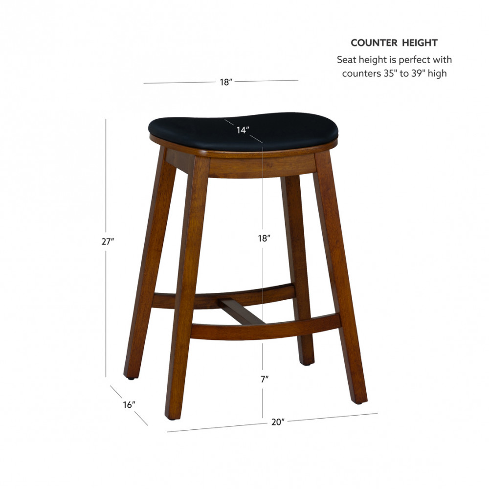 This counter stool offers an updated take on a timeless silhouette that spans centuries and decor styles. Outfitted with plush cushions in black faux leather upholstery, the gently curved seats are as comfortable as they are easy to maintain. The backless design lends itself to a range of placements and uses, whether tucked neatly under a counter, positioned in an open arrangement, or used as extra seating against a wall. With reinforced crossbars doubling as footrests, these stools deliver enhanced stability and support through long meals and conversations. Perfect for midcentury modern, farmhouse, and transitional settings, the rich brown finish on the frames offers a rustic accent that complements just about any decor.