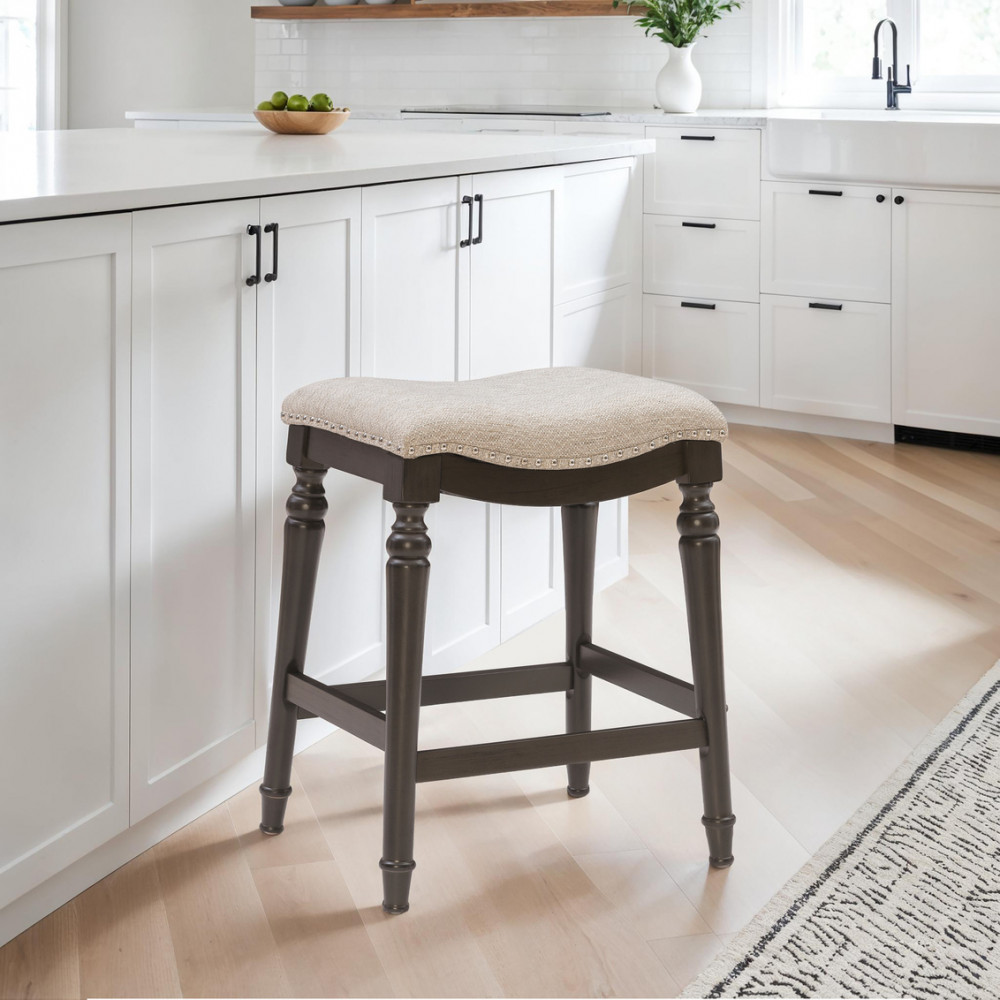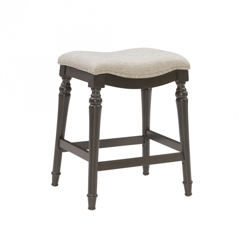 This backless counter stool revitalizes the familiar lines of timeless design with comfort and cost in mind. The 400 lb weight limit stool comes in a stylish grey finish and is made out of rubberwood. Individually placed chrome nail head detailing border. A grey fabric seat tops off this counter stool.