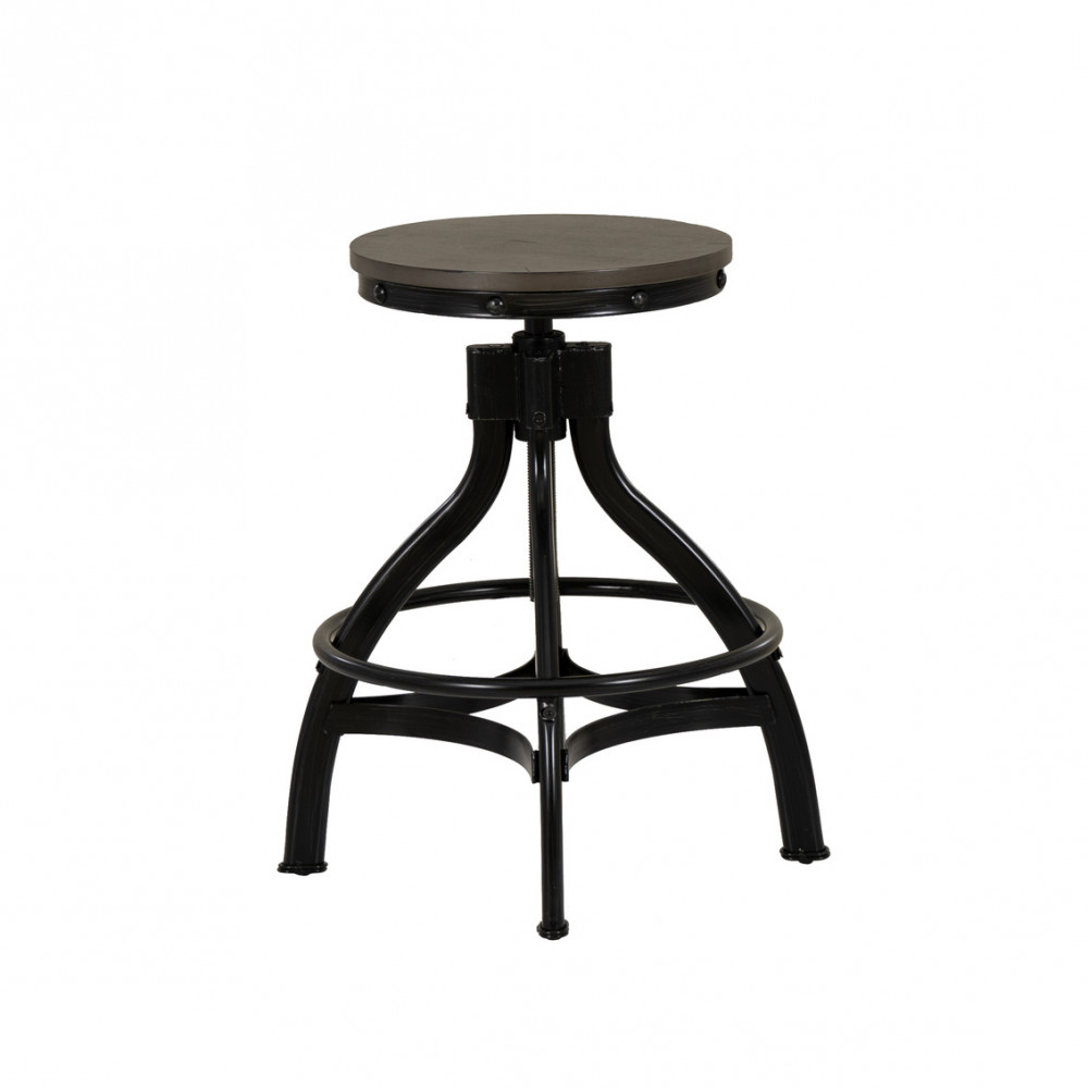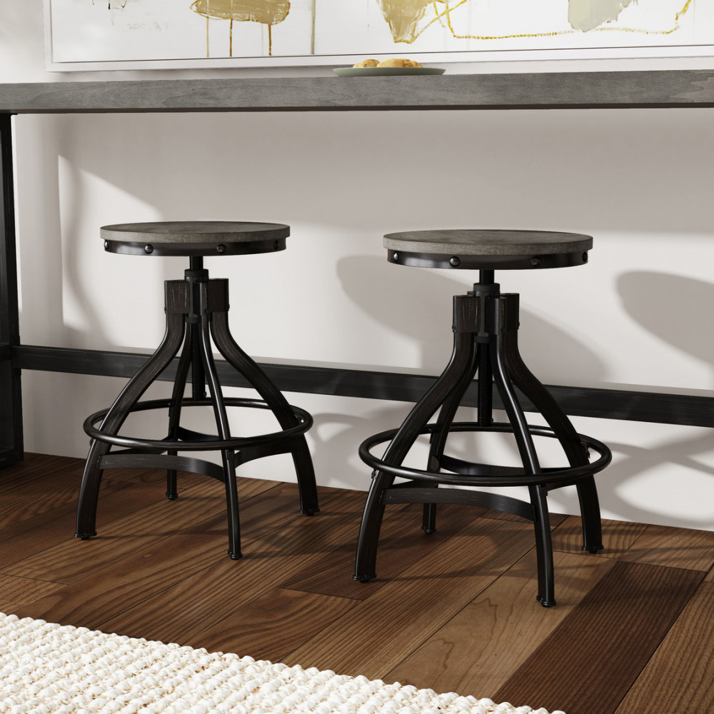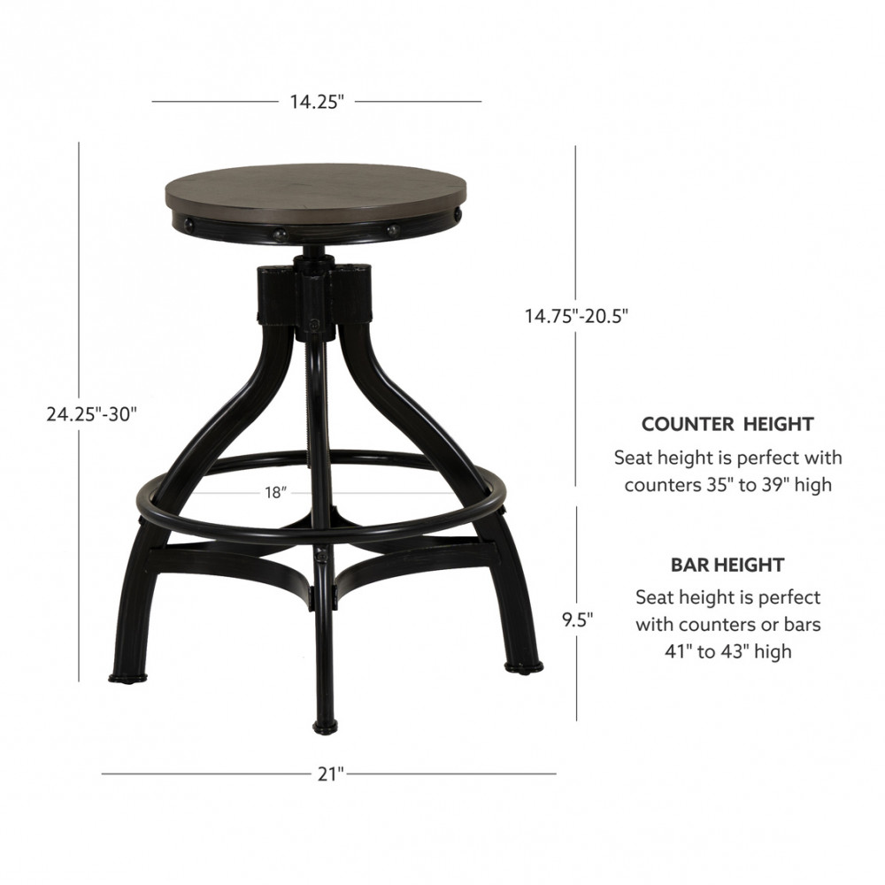 Bring a bold industrial accent to your home with these adjustable stools. Featuring dark gunmetal frames with gracefully curved legs and circular footrests, these stools are both incredibly sturdy and stylish. The round wooden seats swivel 360 degrees and are hand-brushed in a grey stain that beautifully compliments the distressed finish of the industrial bases. Outfitted with adjustable height mechanisms, they can seamlessly transition between 23.25” and 30”, making them ideal for kitchen islands, home bars, and countertop tables. With robust construction, vintage-inspired aesthetics, and adaptable design, this set makes for a striking addition to dining areas, living rooms, and creative workspaces.