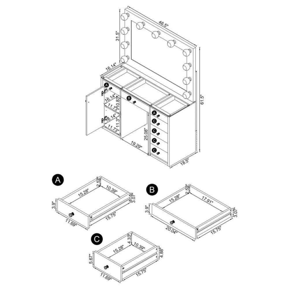 Create space for all your makeup, skincare and hair needs with this contemporary lighted vanity table and mirror. A sleek, fresh look, it boasts a glass top that allows you to see items placed in top drawers. Seven drawers total create easy opportunity for organization of all your products. A cabinet adds adjustable shelving for larger items. The mirror is lighted on three sides, offering multi-directional illumination for even lighting as you apply makeup or fix your hair.