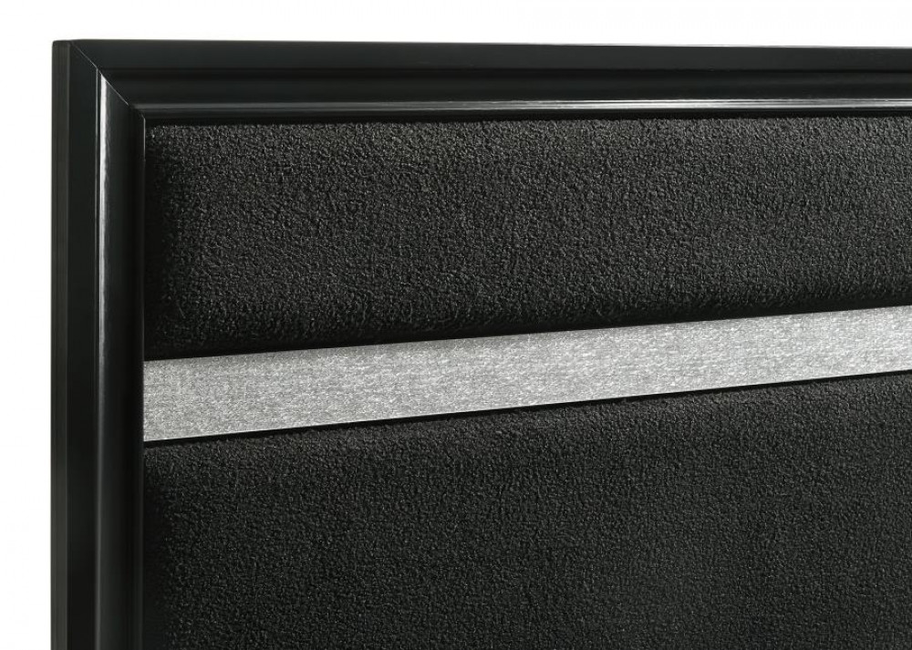 • Upholstered panel bed with padded black headboard panels and glittering accent stripe