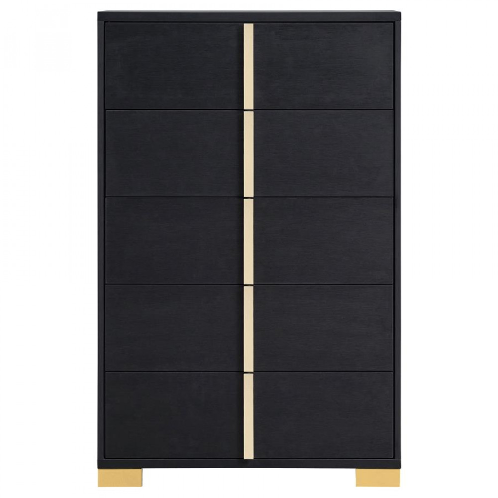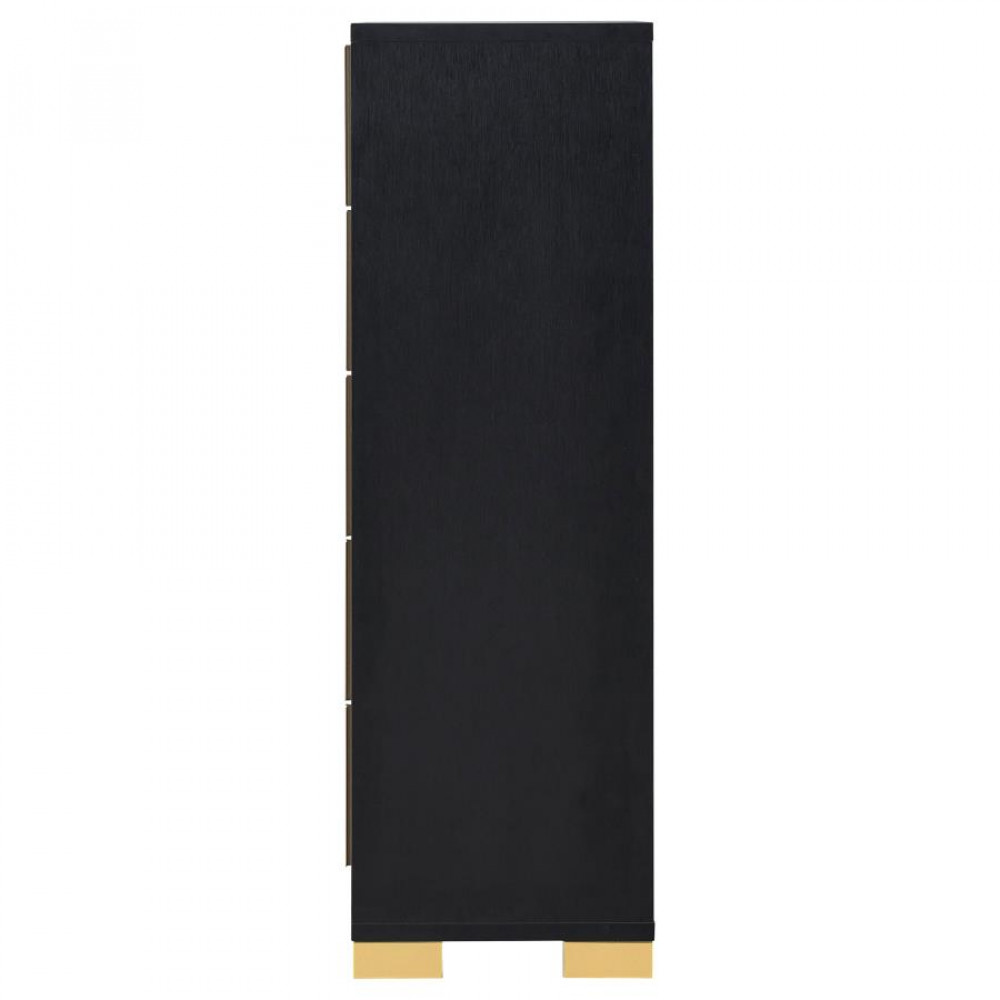 Minimalism never looked so elegant as it does in this elegant five-drawer chest, an excellent option for your updated bedroom ensemble. Modern design details produce a chic vertical chest with an Art Deco vibe and tons of storage space. Made of wood products, this five-drawer chest features a versatile finish with accenting from gold finish metal, placed carefully to emphasize a geometric linear effect. Store incidentals and accessories in drawers operating smoothly on center metal glides. English dovetail drawer construction embellishes this chest’s quality, as vertical gold metal drawer hardware offers a unique impact.