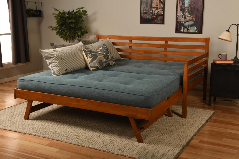 Boho Daybed in Barbados Finish with Pop Up Trundle and Two Linen Aqua Mattress