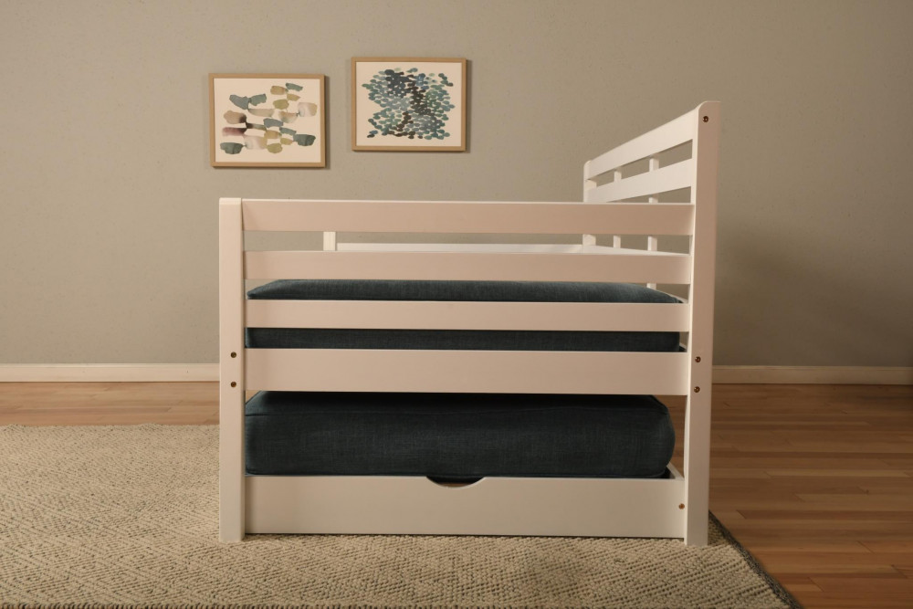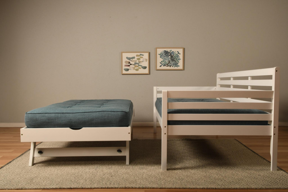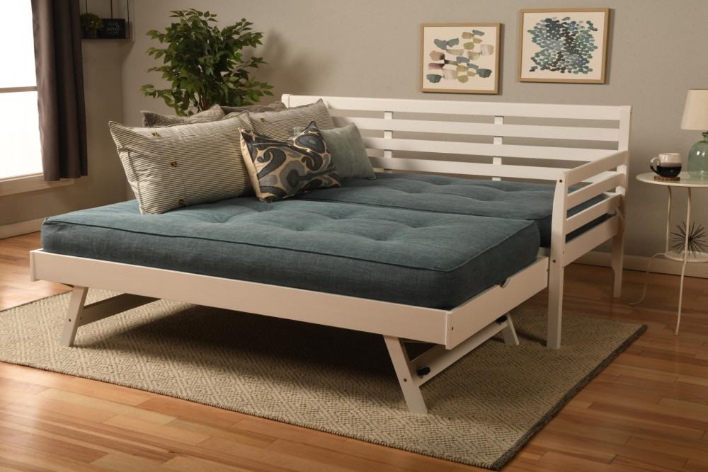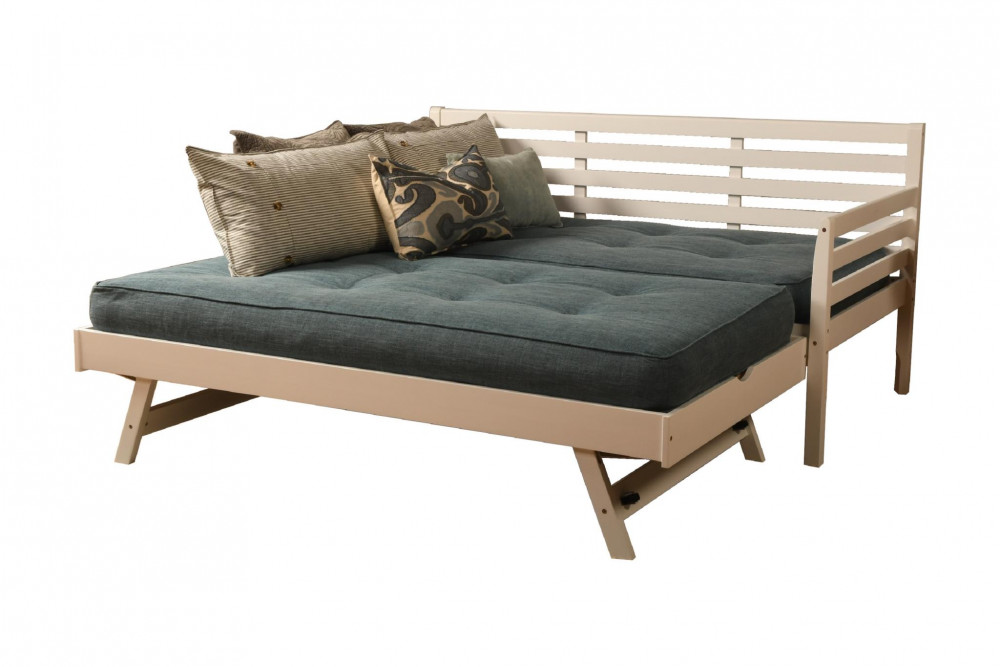 Boho Daybed in White Finish with Pop Up Trundle and Two Linen Aqua Mattress