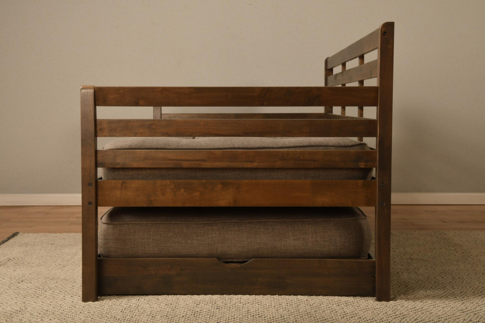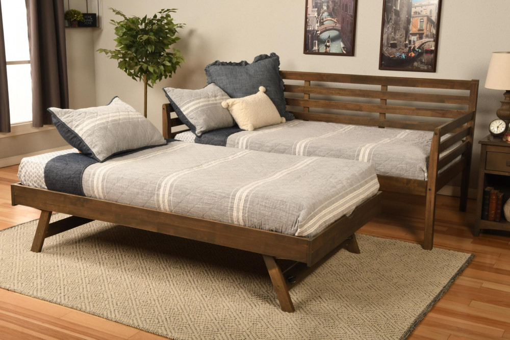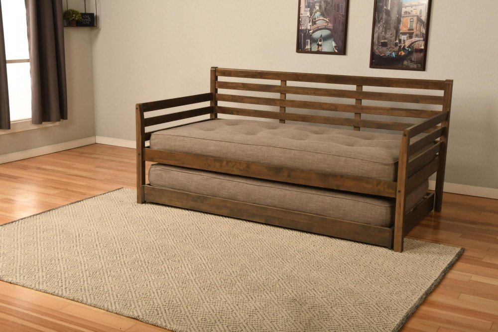 Boho Daybed in Rustic Walnut Finish with Pop Up Trundle and Two Linen Stone Mattress