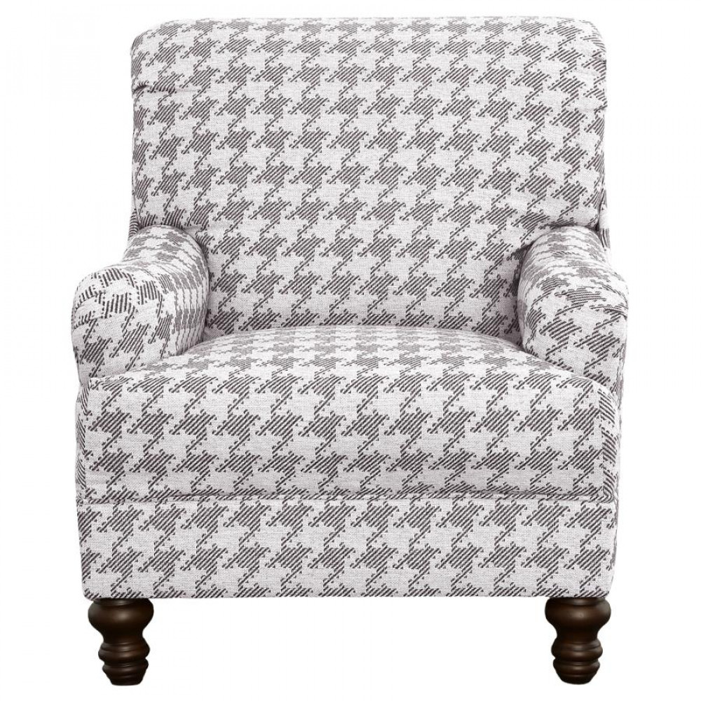 Create a beautifully styled living room that exudes classic character. This modern farmhouse accent chair makes any living space feel a bit more inviting. A rolled back and tailored English arms add a dash of character to its classic silhouette. A plush, padded seat creates a comfortable space to enjoy hours of casual lounging. This grey chair boasts a charming houndstooth pattern all over for a charming accent to any room.