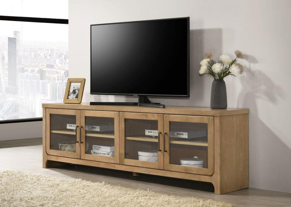 A celebration of craftsmanship and function, this expansive TV stand brings quiet charm to any living room or entertainment space. Framed in warm washed oak with glass-front cabinet doors, it offers a balanced blend of display and storage. Crafted from solid rubberwood, engineered wood, and white oak veneer, this console houses media components with ease, thanks to spacious shelving and built-in cord access that keeps everything neat and ready for viewing.