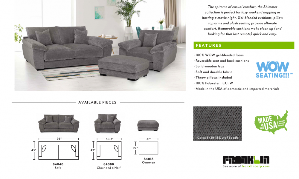 The epitome of casual comfort, the Cloud 9 Urban Seal Sofa is perfect for lazy weekend napping or hosting a movie night. This collection includes a sofa, chair and a half, and matching ottoman. Each piece is covered in a soft, durable gray fabric. Coordinating pillow in the same fabric are included, completing the overall look.