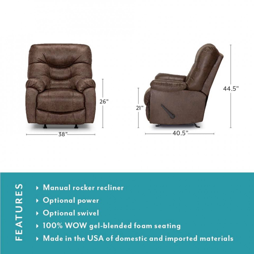 The Trilogy Rocker Recliner delivers a trilogy of comfort, support, and relaxation. Its cradle-back design contours perfectly to your body, providing an exceptional lounging experience. This manual rocker recliner offers smooth, effortless operation, while our WOW Seating System combines precision-cut wood frames with gel-blended foam seating for unmatched comfort and durability. Built to support up to 275 lbs., the Trilogy is the perfect choice for relaxing in style—because great things come in threes!