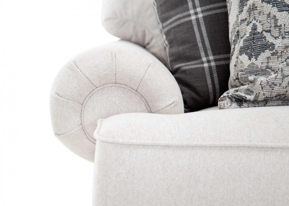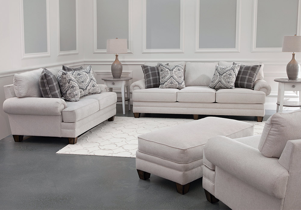 The Walden Collection brings an inviting blend of comfort and sophistication to your home. This large-scale sofa group includes a sofa, loveseat, chair and a half, and matching ottoman, making it the perfect choice for larger living spaces and gatherings. Each piece is upholstered in a soft, durable light beige fabric that complements a wide range of décor styles. Coordinating accent pillows in soothing hues enhance the overall look, adding a touch of elegance and warmth. while solid wooden legs ensure durability and a polished finish.
