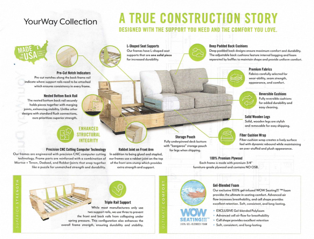 The YourWay features our WOW Seating System, which combines precision-cut wood frames with gel-blended foam seating for exceptional support. Its reversible seat and back cushions allow for easy flipping to ensure even wear, keeping your furniture looking fresh and comfortable for years to come.