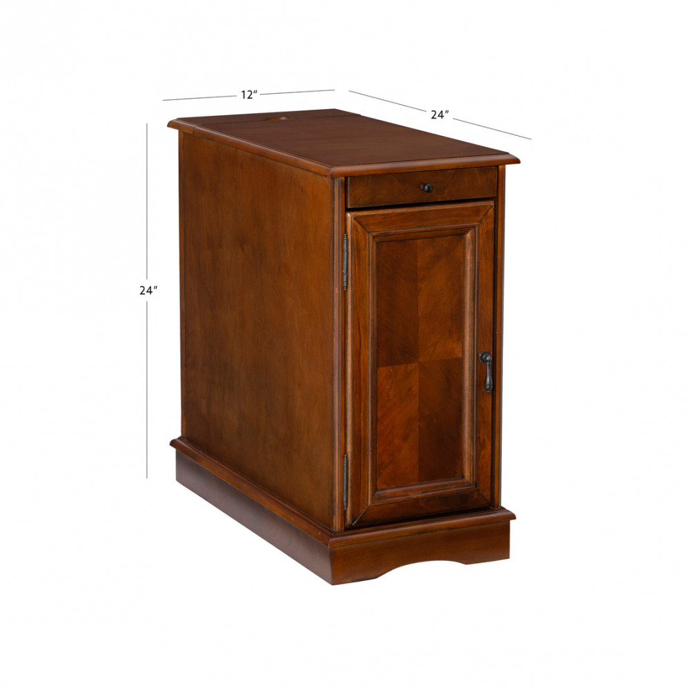 Stay connected in style with this compact accent table, finished in a warm hazelnut stain for a sophisticated look in any space. Designed to meet the demands of modern life with timeless style, it features a rear compartment with built-in USB charging and power outlets hidden behind a flip-top panel. At just 12" wide and 24" deep, it fits neatly beside sofas, chairs, or beds while providing ample surface space for a lamp, books, or gaming gear. A pull-out tray with integrated cup holders adds bonus room for drinks or snacks, while the lower cabinet with a fixed shelf keeps essentials tucked away. Smart, streamlined, and full of surprises—this piece makes small-space living feel effortlessly functional.