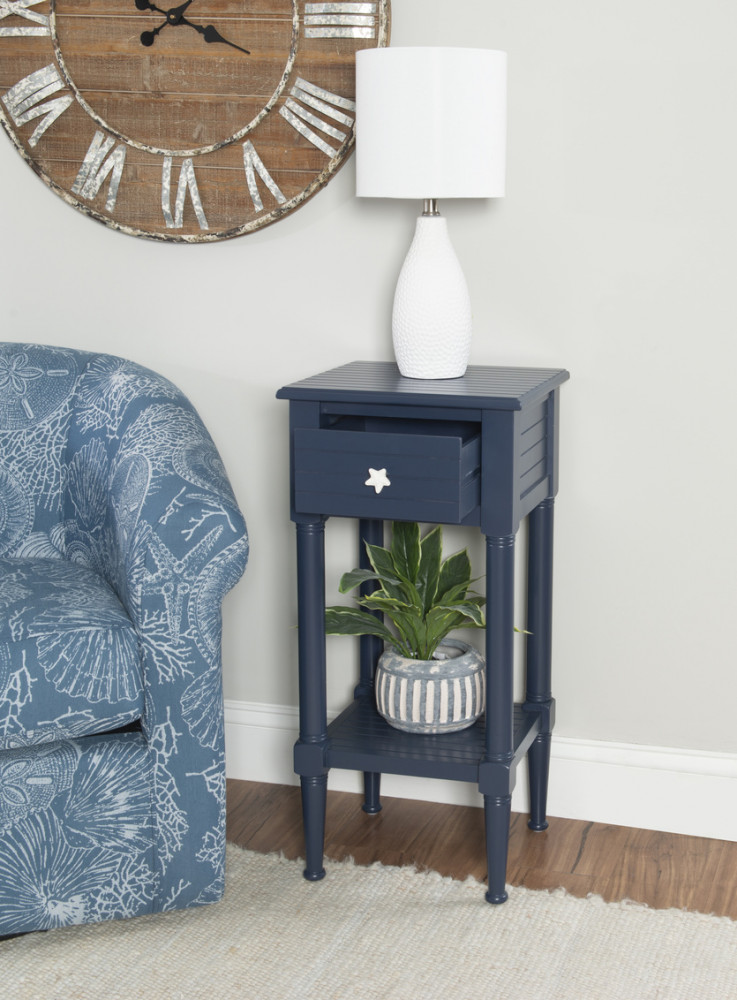 Add coastal ambiance to your favorite space with this lovely nautically themed end table. Featuring a navy blue finish, this square wood table is the perfect place for a lamp and a cup of coffee while relaxing with a book. Adorned with a decorative starfish knob, the single drawer keeps essential items within easy reach, while the lower shelf is perfect for displaying photographs and keepsakes. Ideal as a living room side table, bedroom nightstand, or bathroom stand, this table will make a delightful accent to your home decor.