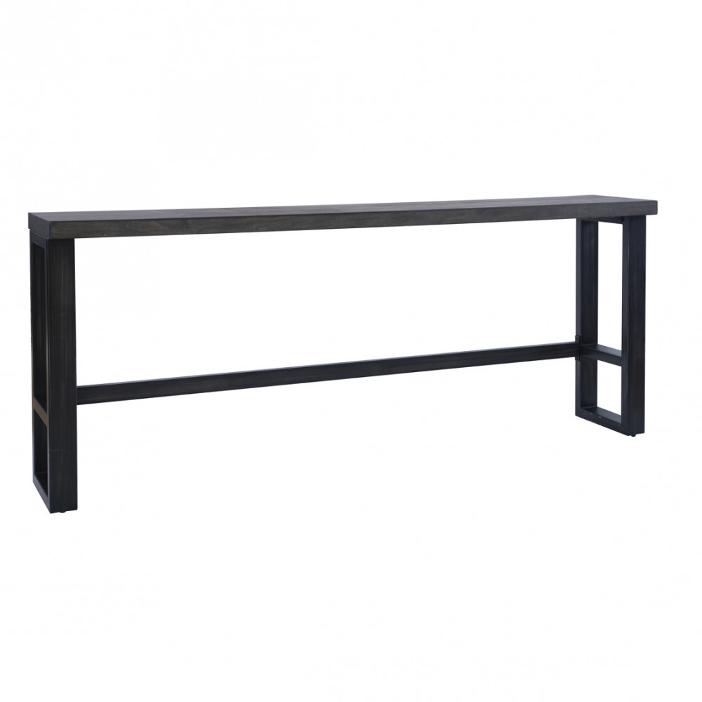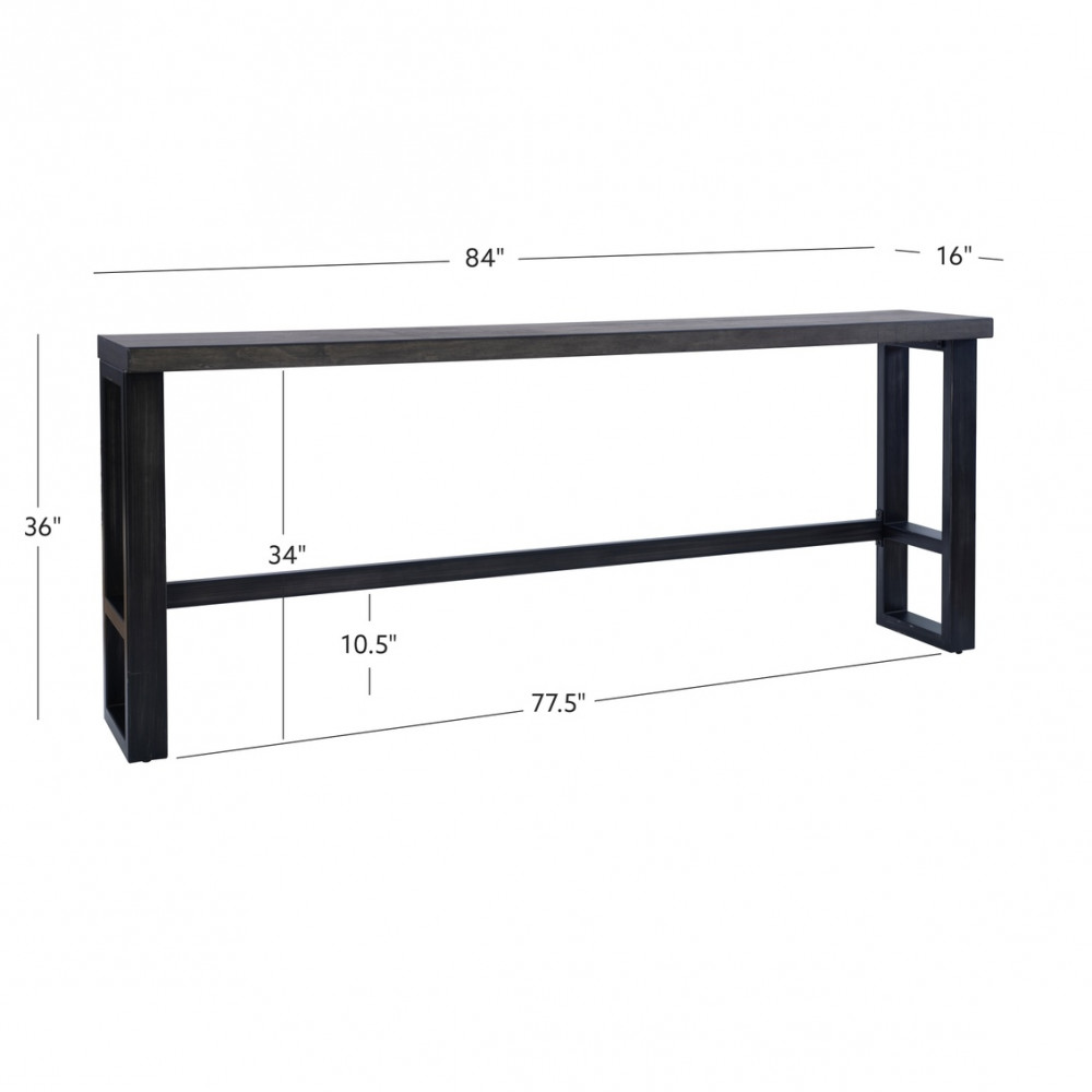 Crafted with both functionality and minimalist style in mind, this sofa bar table is a fundamental solution for modern living spaces. Measuring 13" x 84", the tabletop provides ample surface area for 4 place settings, a buffet layout, or decorative items, making it a perfect foundation for whatever the day throws at you. The distressed wooden block top features veneers finished in a grey hand-brushed stain that embellishes the beautiful knots and grain patterns for an artisanal accent. In the support role is a sturdy metal base in a gunmetal finish that leans into an industrial aesthetic. This table’s slim profile makes it an ideal choice for placement behind a sofa, against a wall in a compact dining room, or as a kitchen island. Space-conscious and versatile in its pairings, this piece blends seamlessly into transitional, rustic, and industrial interiors