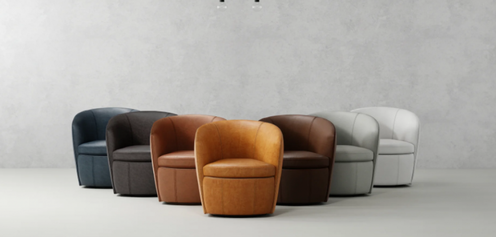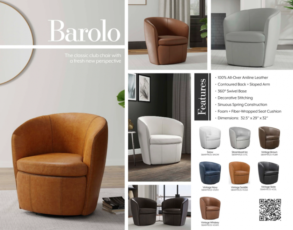 Our timelessly chic Barolo leather swivel chairs feature a classic yet versatile silhouette that fits effortlessly into almost any room. This low-profile barrel seat is wrapped in glove soft leather, offering 360-degree swivel action to allow for quick pivots in any direction. Bold decorative stitching elevates this chair to the next level, securing its place as a tried-and-true staple piece in your living space.