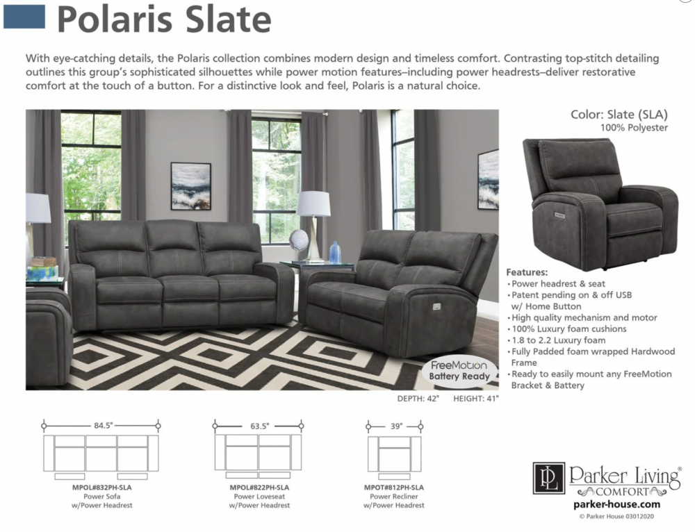 P2: Power seat and headrest provides stress-relieving comfortFeatures integrated USB charger with patent-pending Parker Switch ON/OFF function for managing power drawOversized seats sit like a chair-and-a-half for expansive comfortHeavy-duty, high performance fabric cover ideal for kids and petsDecorative top stitching in contrasting thread adds eye-catching characterTraditional bench seat design is perfect for stretching across and nappingWide, curved track arm and picture-frame back design complement any decorating style3-year Limited Warranty on the frame, springs, mechanism and motor while the cover, seams and cushions are warranted for one yearDesign ensures easy placement and mounting of a FreeMotion bracket and batteryIncludes Sofa & Love Seat