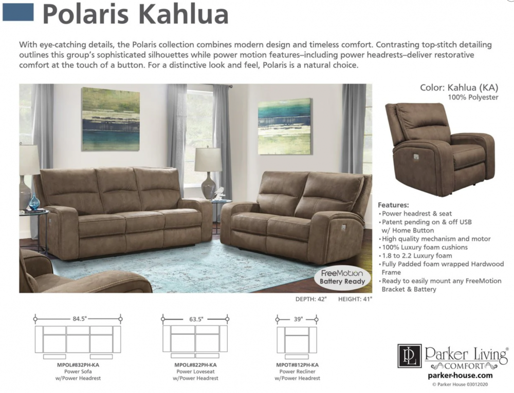 P2: Power seat and headrest provides stress-relieving comfortFeatures integrated USB charger with patent-pending Parker Switch ON/OFF function for managing power drawOversized seats sit like a chair-and-a-half for expansive comfortHeavy-duty, high performance fabric cover ideal for kids and petsDecorative top stitching in contrasting thread adds eye-catching characterTraditional bench seat design is perfect for stretching across and nappingWide, curved track arm and picture-frame back design complement any decorating style3-year Limited Warranty on the frame, springs, mechanism and motor while the cover, seams and cushions are warranted for one yearDesign ensures easy placement and mounting of a FreeMotion bracket and batteryIncludes Sofa & Love SeatLIMITED QUANT