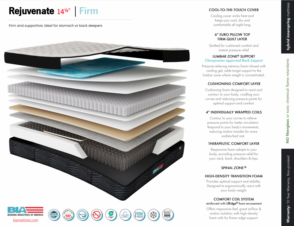 All of these mattresses feature individually wrapped coils and comfort coil system reinforced with LifEDGE foam encasement, as well as and multiple layers of unique foam layers delivering individual comfort levels making it easy to choose your perfect mattress. It also boasts a COOL-TO-THE-TOUCH cover. Plus, enjoy on all models Chiropractor-Approved back support with the patented Lumbar Zone Support Crown. Don't worry about any chemical additives in any of the BIA mattress as they feature Natural FR, so no fiberglass or toxic chemical flame retardants ere ever used in their mattress designs! All foams used are CertiPUR-US certified!