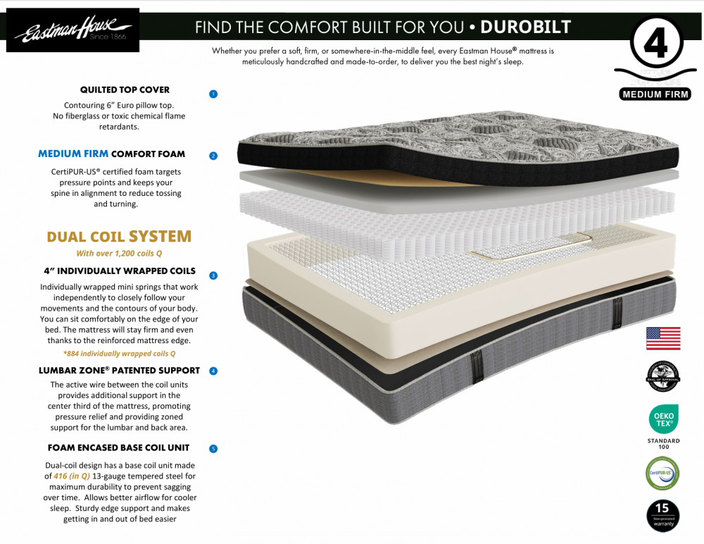 All of these mattresses feature dual coil system with coils and multiple layers of unique foam layers delivering individual comfort levels making it easy to choose your perfect mattress. Plus, enjoy on all models Chiropractor-Approved back support with the patented Lumbar Zone Support Crown. Don't worry about any chemical additives in any of the Eastman House mattress as they feature Natural FR, so no fiberglass or toxic chemical flame retardants ere ever used in their mattress designs! All foams used are CertiPUR-US certified!