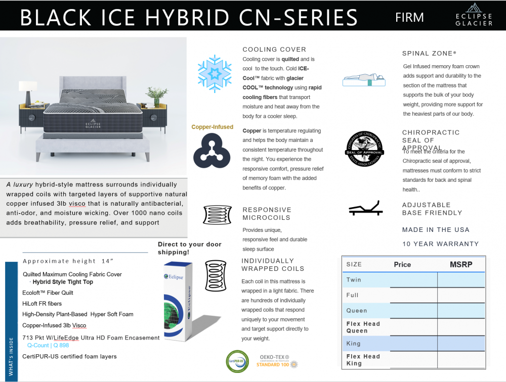 Introducing the Black Ice Nano Copper Plush Hybrid Mattress. A full-on quality experience to sculpt to your exact bodily needs. A luxury hybrid-style mattress surrounds individually wrapped coils with targeted layers of supportive natural copper infused 3lbs visco that is naturally antibacterial, anti-odor, and moisture wicking. Over 1000 nano coils adds breathability, pressure relief, and support.