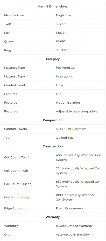 The Lombard Super Firm mattress is E Hotel Collection crafted by Englander. This mattress has Posturized Lumbar Support, Perimeter foam encasement, and Gel/Poly Comfort Layers. Which ensures anyone using the Lombard mattress will get a great night of sleep. Englander is crafted here in the United States. Why look anywhere else when perfection is right in front of you.